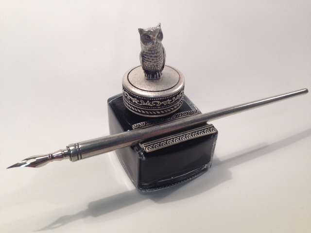 Dieses Tintenfass ist mit schwarzer Tinte gefüllt, die nur für den Federhalter gegeignet ist. Es sieht auf jedem Schreibtisch fantastisch aus. Es gibt noch weitere Motive.. z. B. ein Pferd, ein Drache...